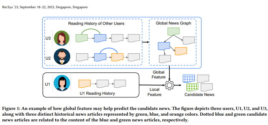 - 그러나, 이전까지의 방법들은 한 명의 user reading history에만 초점을 맞추기 때문에 global한 관점이 부족하다고 지적함. 그래서 local representation과 global representation을 둘 다 활용하여 추천하고자 한다.